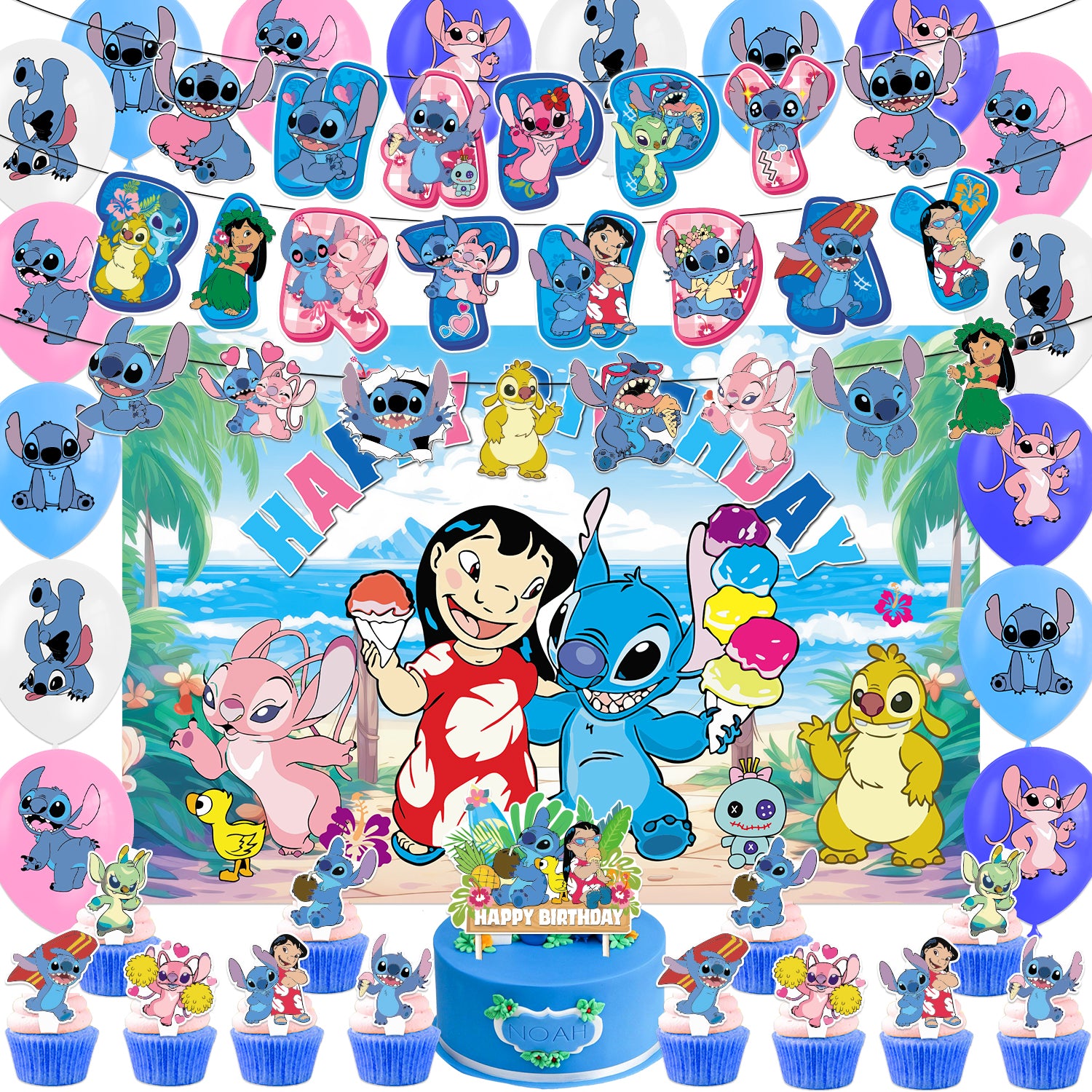 Bring the tropical vibes and playful spirit of Stitch to your child's birthday with this vibrant party decoration set! Perfect for fans of Lilo & Stitch, this kit has everything you need to transform your party space into an island paradise.